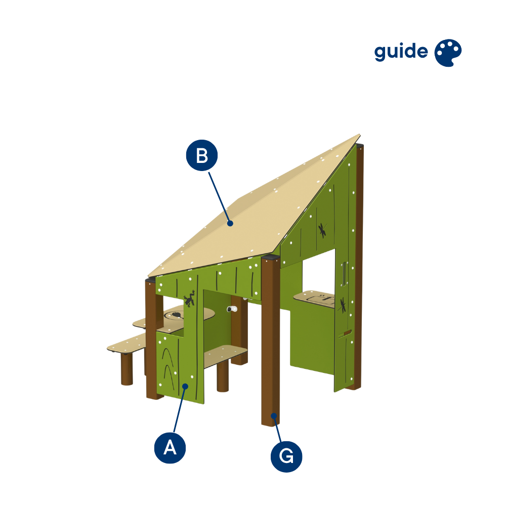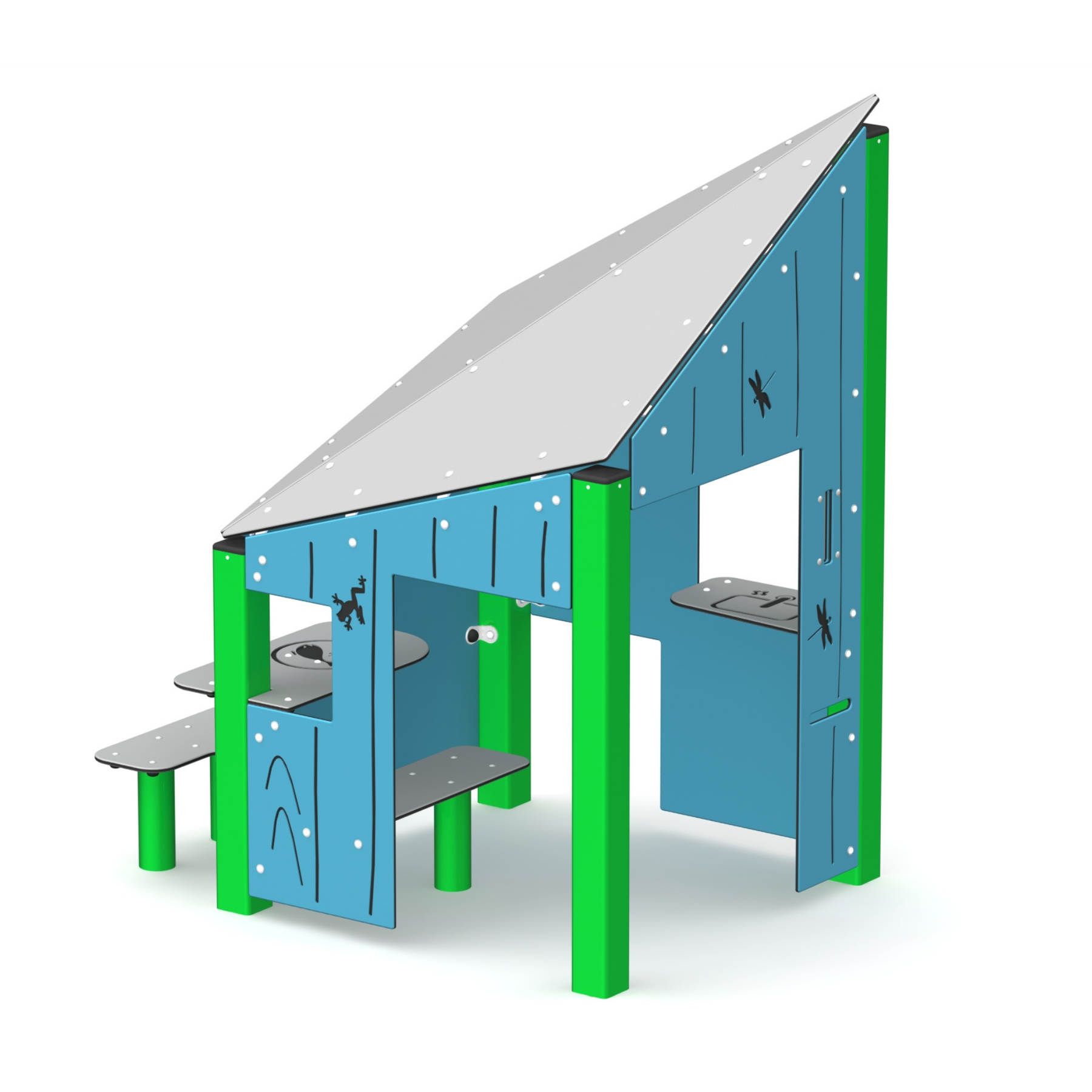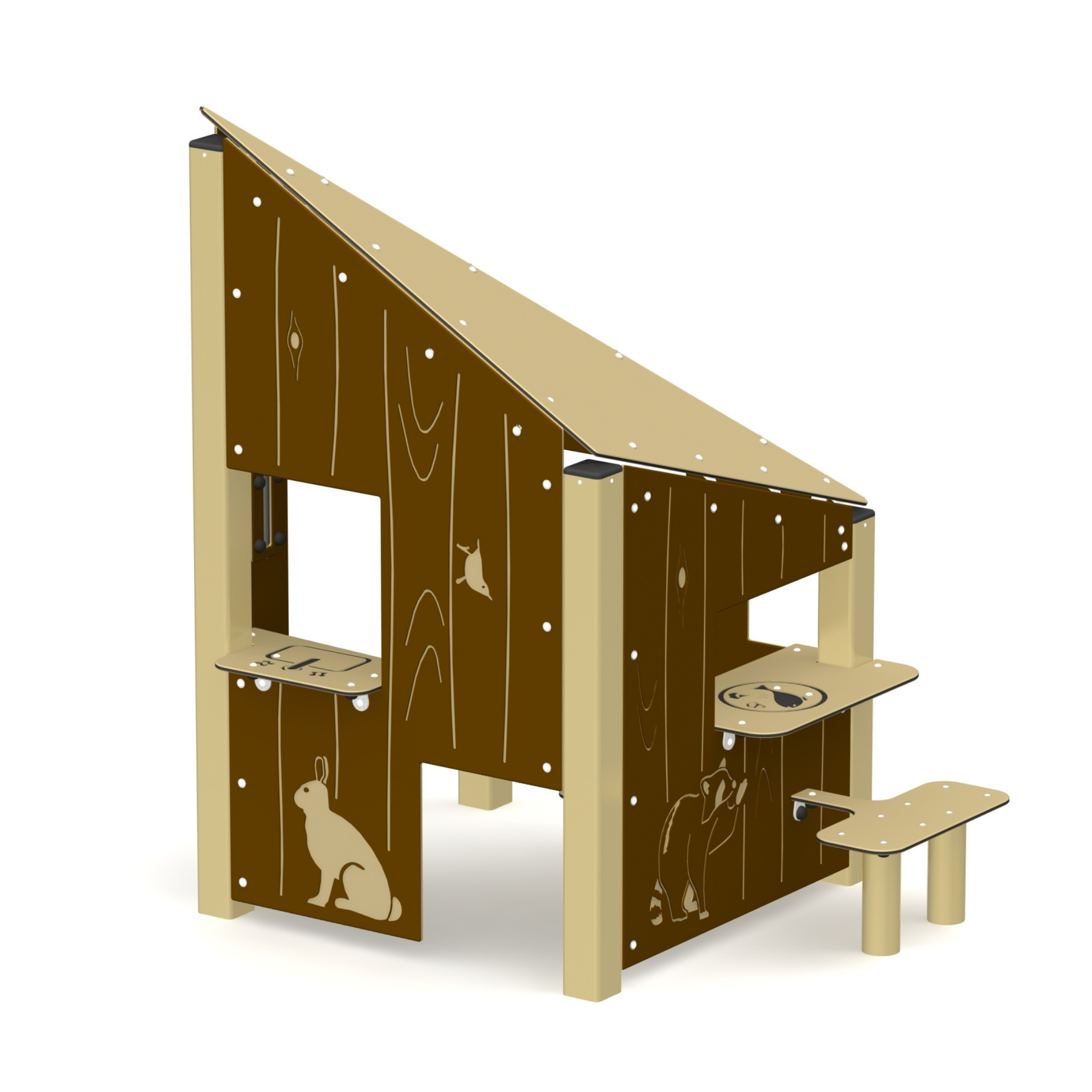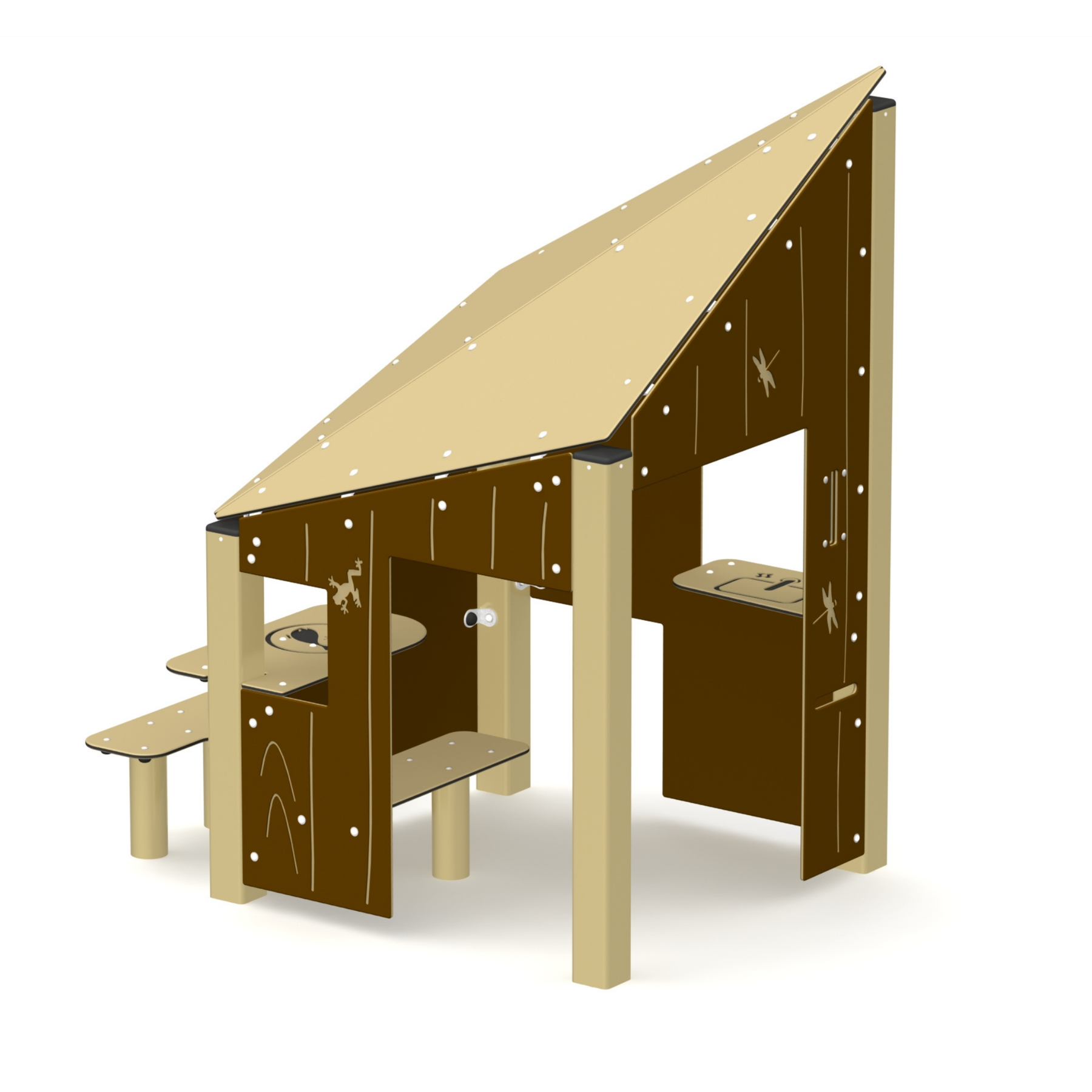 A make-believe playhouse with the look of a woodland camp! Furnished with a table and two seats inside, children can make up scenarios and role-play games galore and imagine themselves at home, at the store, at the restaurant, etc. Several window openings, the counters, outdoor seating and original engravings complete the play experience.