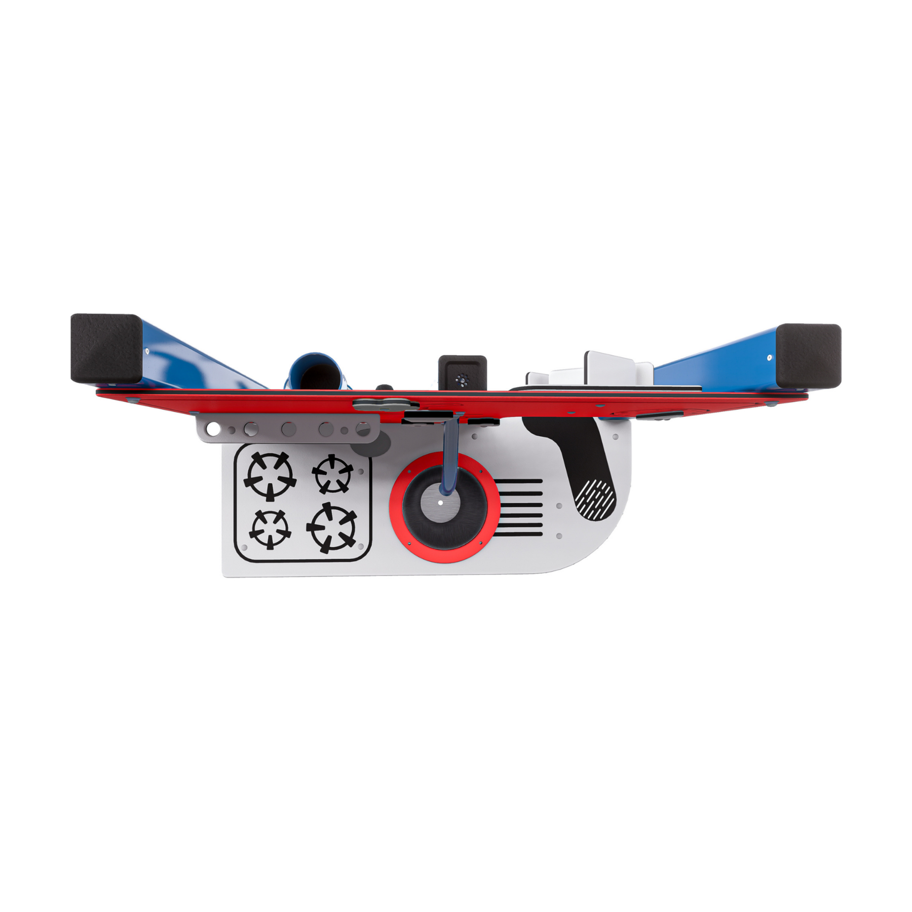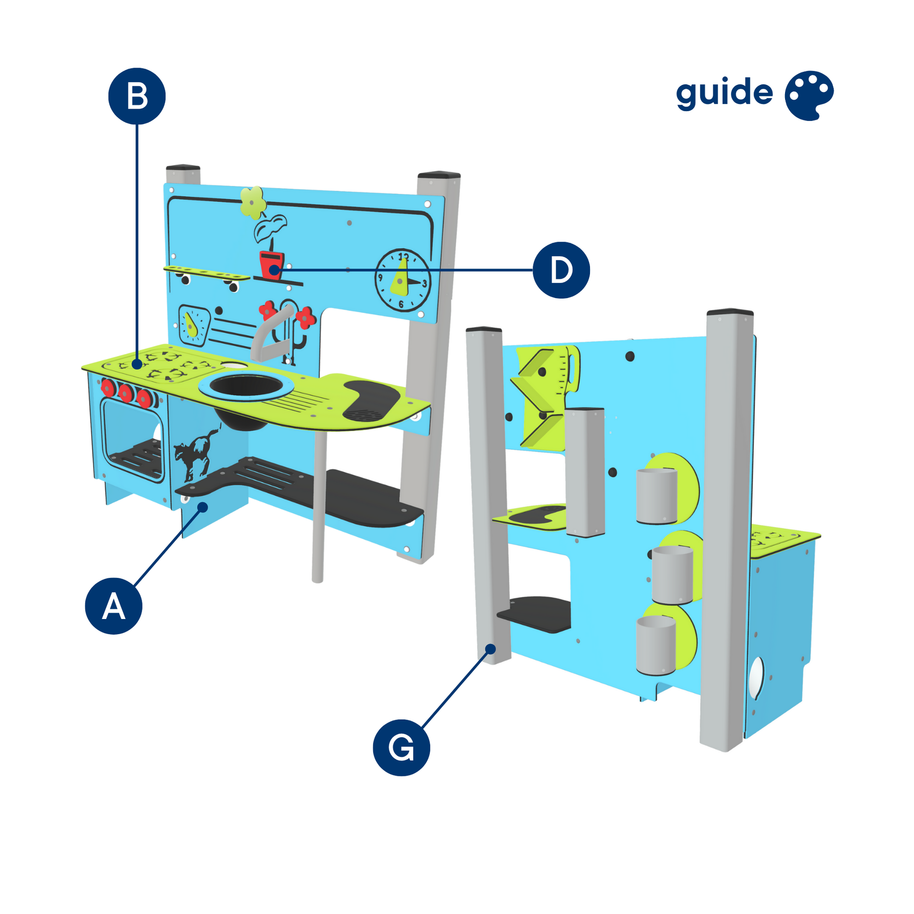 Cuisinette avec de nombreux accessoires. Une structure faite de poteaux d’aluminium et de solides panneaux de polyéthylène. Les pictogrammes et dessins sont réalisés par une machine rotative automatisée qui grave et fait ressortir la couleur du cœur des panneaux.